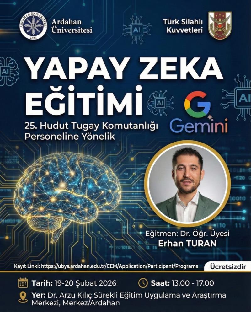 Dr. Öğr. Üyesi Erhan TURAN tarafından verilecek olan YAPAY ZEKA EĞİTİMİ, 25. Hudut Tugay Komutanlığı personeline yöneliktir.